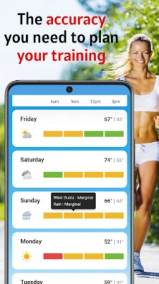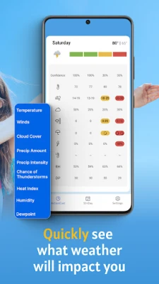 Looking to find the best day this weekend to golf/hike/bike/run? Easily identify the best day of the week with our green/yellow/red stoplight coloring. We summarize the forecast into one color at each hour to make your decision making simple.