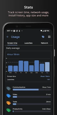 Get details about screen time and number of launches. By default, a weekly average is shown. Tap on the bar graph to show details for each day. You may show usage details for individual apps, or aggregated usage by tag.