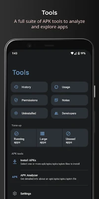• Analyze, extract, share or install any APK, APKS, XAPK or APKM file
