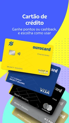 • Cartão de crédito e débito: acompanhar limite, faturas, parcelar compras.