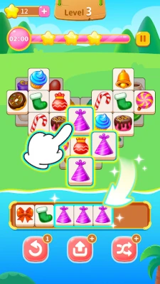 After entering the level, you will see 3D tiles with multiple cartoon patterns, dozens of cartoon cute pets, Christmas themes and daily wear, etc., multiple elimination options, the gameplay is not heavy! There is a collection box below the tile, which can only be put down at most seven tiles. If you want to increase the placement area, click the additional number but only eight can be placed at most ~